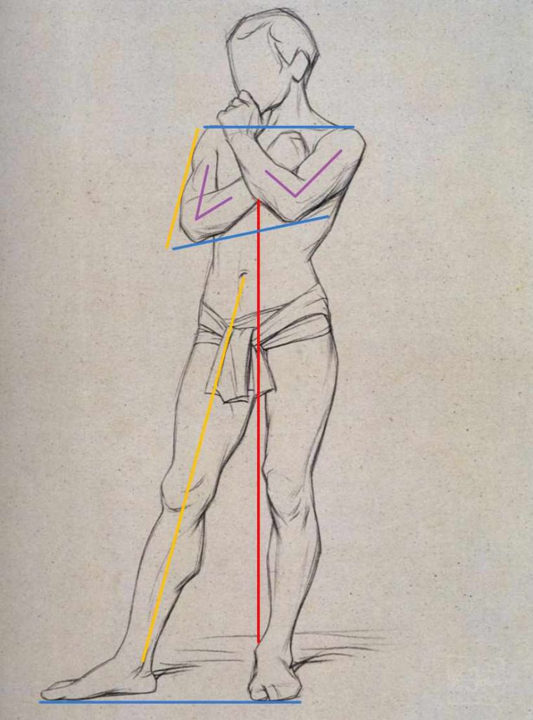 Figure 1. Just a few simple straight lines can help you see proportions by comparing how body parts relate to each other. Take a look at how the crossed arms line up with the ankle of the weight-bearing leg. Notice how this line acts as a central axis, even though the belly button isn’t perfectly centered on it. In your drawing, this line will help structure most of the body. Now notice how the shoulders and feet sit on straight horizontal lines, while the elbows follow a gentle tilt. Both elbows are clearly above the waist, even though in a relaxed arm position they would align with it. An imaginary diagonal line running through the leg connects the belly button to the ankle and shows the leg and arm are parallel. Finally, observe the arm angles: one elbow bends at 90°, while the other forms a sharper angle. All these lines help you judge proportions in a human figure in an indirect yet elegant way, working particularly well in complex and short poses.