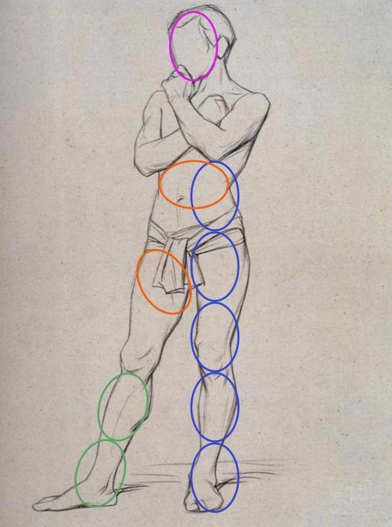 Starting at the beginning, if you’re wondering whether there’s some hidden equation governing proportions, sorry to disappoint, there isn’t. Many have tried to devise a mathematical formula for the “perfect” human figure, but these efforts always fall short, not only because real bodies rarely match idealized measurements, but also because drawing inevitably involves perspective. That said, a few simple rules can be helpful. The body’s midpoint always sits slightly below the belly button, meaning the legs make up a little less than half of the total height. The arms are shorter than the legs, with the elbows roughly lining up with the waist and the hands reaching about mid-thigh.