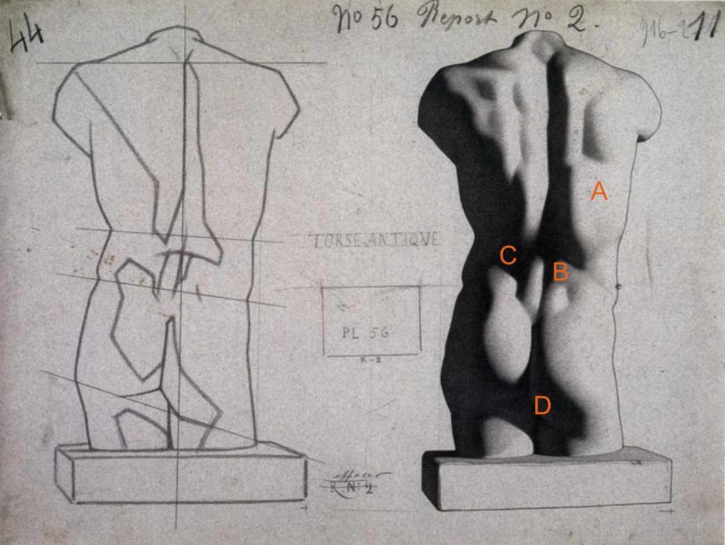 Figure 3. Straight lines mark the initial light-shadow divide, showing how the artist separates areas of light and shadow. Notice the horizontal lines that indicate the body’s gradual tilt. The final drawing shows lights (A), mid-tones (B), shadows (C), and reflected light (D) across the forms, clearly illustrating the full range of tonal values used in figure drawing.